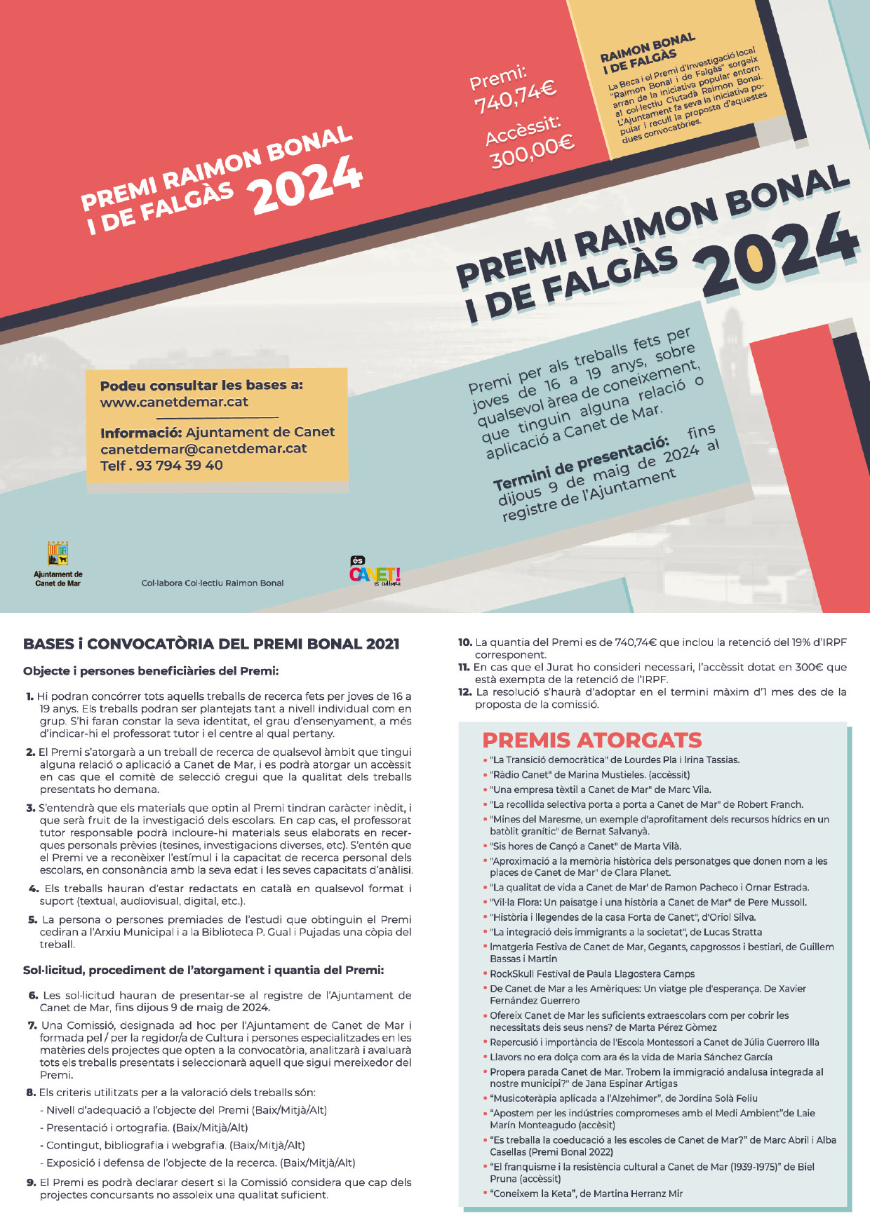 El Premi Raimon Bonal i de Falgàs és per a treballs de recerca relacionats amb Canet de Mar, elaborats per joves d'entre 16 i 19 anys.