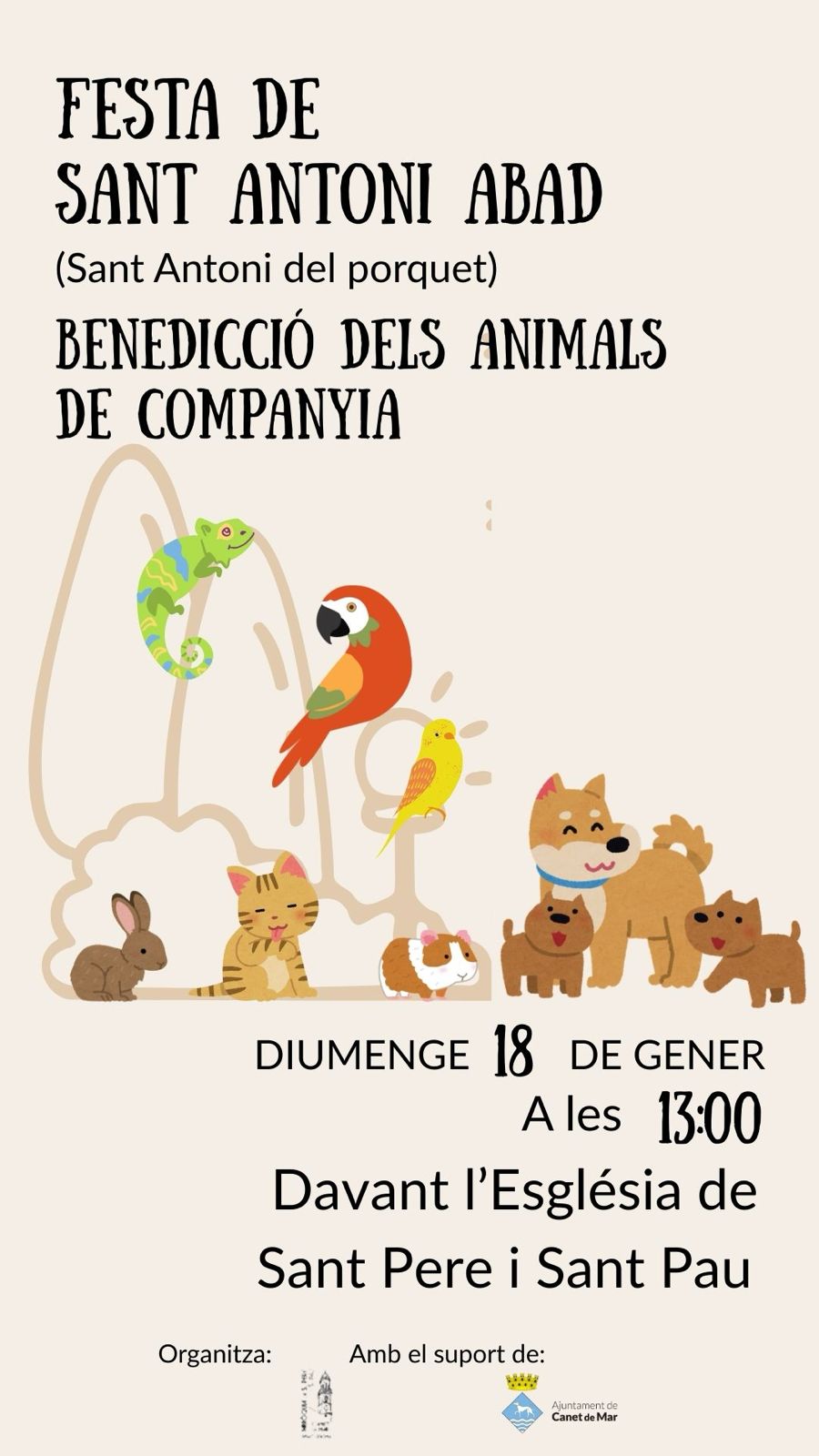 L’Ajuntament de Canet de Mar convida la ciutadania a participar en la Festa de Sant Antoni Abat, popularment coneguda com Sant Antoni del Porquet, que tindrà lloc el diumenge 18 de gener de 2026, a les 13.00 h, davant l’església de Sant Pere i Sant Pau.