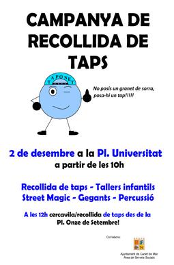 Aquest diumenge, 2 de desembre, es farà la festa final de la campanya que s'ha dut a terme les darreres setmanes i que ha consistit a recollir taps de plàstic per una causa solidària. La iniciativa, que va sorgir de particulars vinculats amb Protecció Civil de Canet i que ha comptat des de l'inici amb tot el suport i la col·laboració de l'Àrea de Benestar Social de l'Ajuntament, s'ha estès per la població i ha fet que molts canetencs dipositessin als llocs assenyalats els taps de tot tipus de productes: detergents, aigua, llet, sabons ... Aquest diumenge, a partir de les 10 del matí a la plaça Universitat es farà l'acte final de la campanya. Tothom que hagi estat guardant taps a casa els pot portar a la plaça, que també seran recollits.