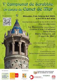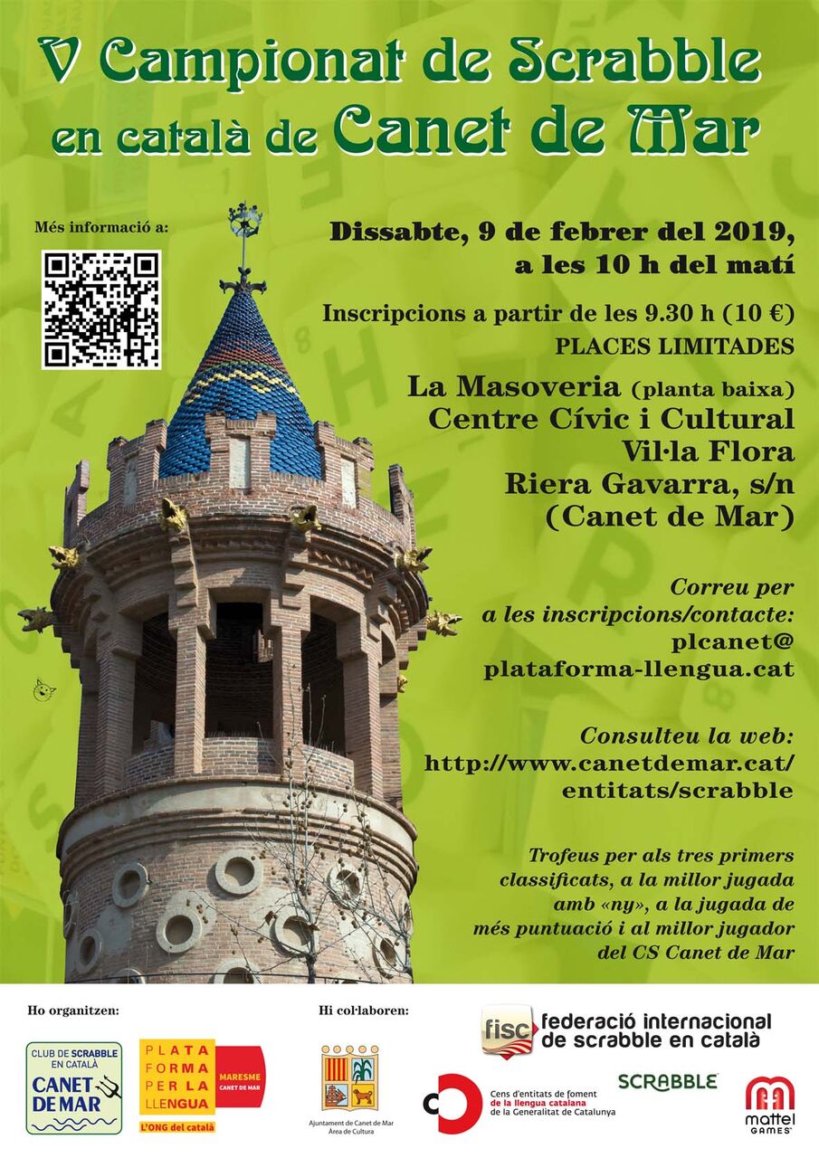 El dissabte 9 de febrer, el Club de Scrabble en Català Canet de Mar i la secció local de Plataforma per la Llengua, amb la col·laboració de la Federació Internacional de Scrabble en Català i l´Ajuntament de Canet de Mar, celebrarem el V Campionat de Scrabble de Canet de Mar a La Masoveria (planta baixa) del Centre Cívic i Cultural Vil·la Flora (riera Gavarra, s/n).
