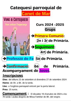 Del 23 al 27 de setembre inscripcions per els diferents nivells de Catequesi de 5 a 6 de la tarda a la parroquia.