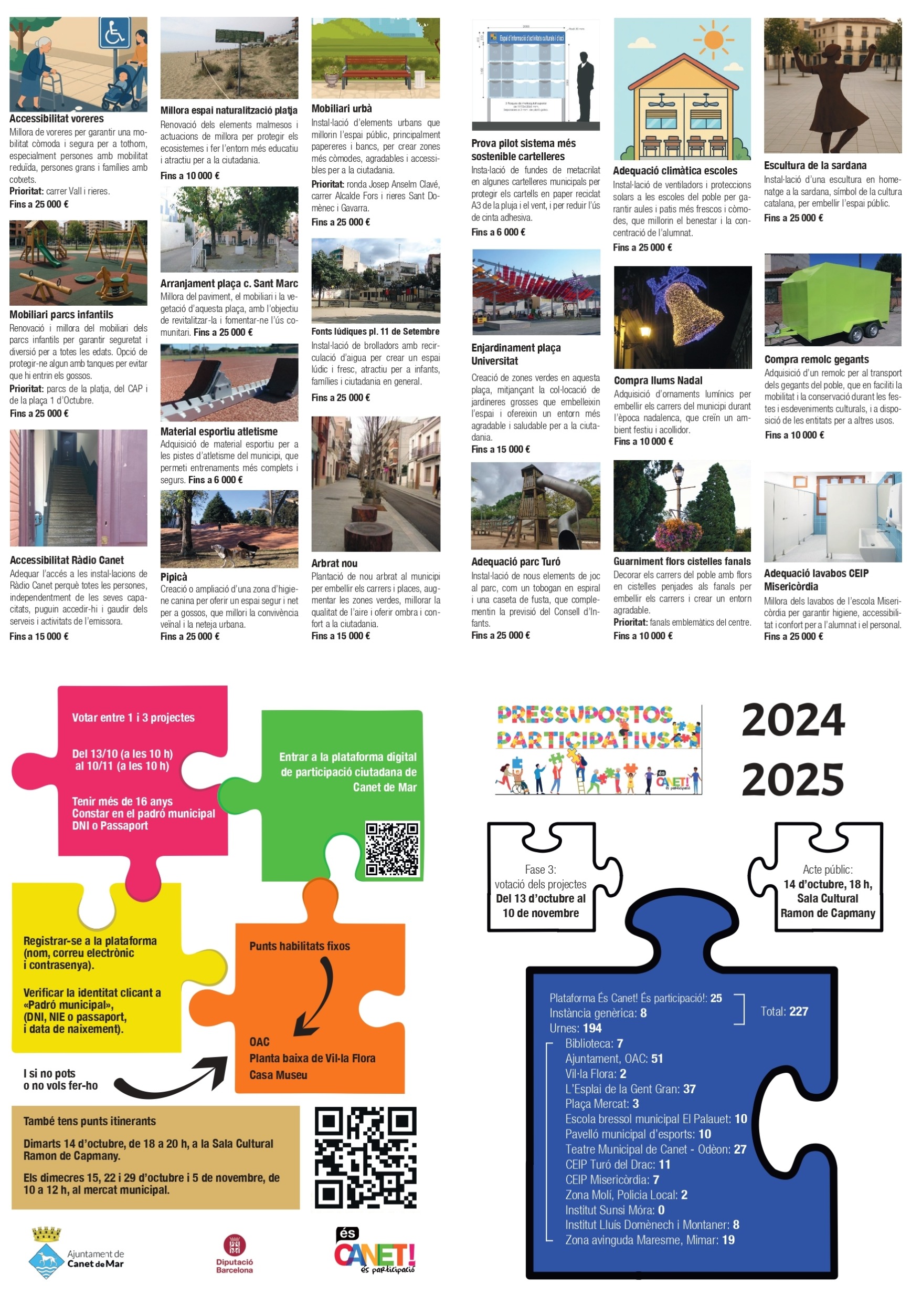 La ciutadania canetenca va presentar 227 propostes en la fase 1 d'aquest procés participatiu. Després de deliberar i valorar-les, la comissió ciutadana i política de seguiment ha decidit quines passen finalment a votació. Es tracta de 19 projectes: