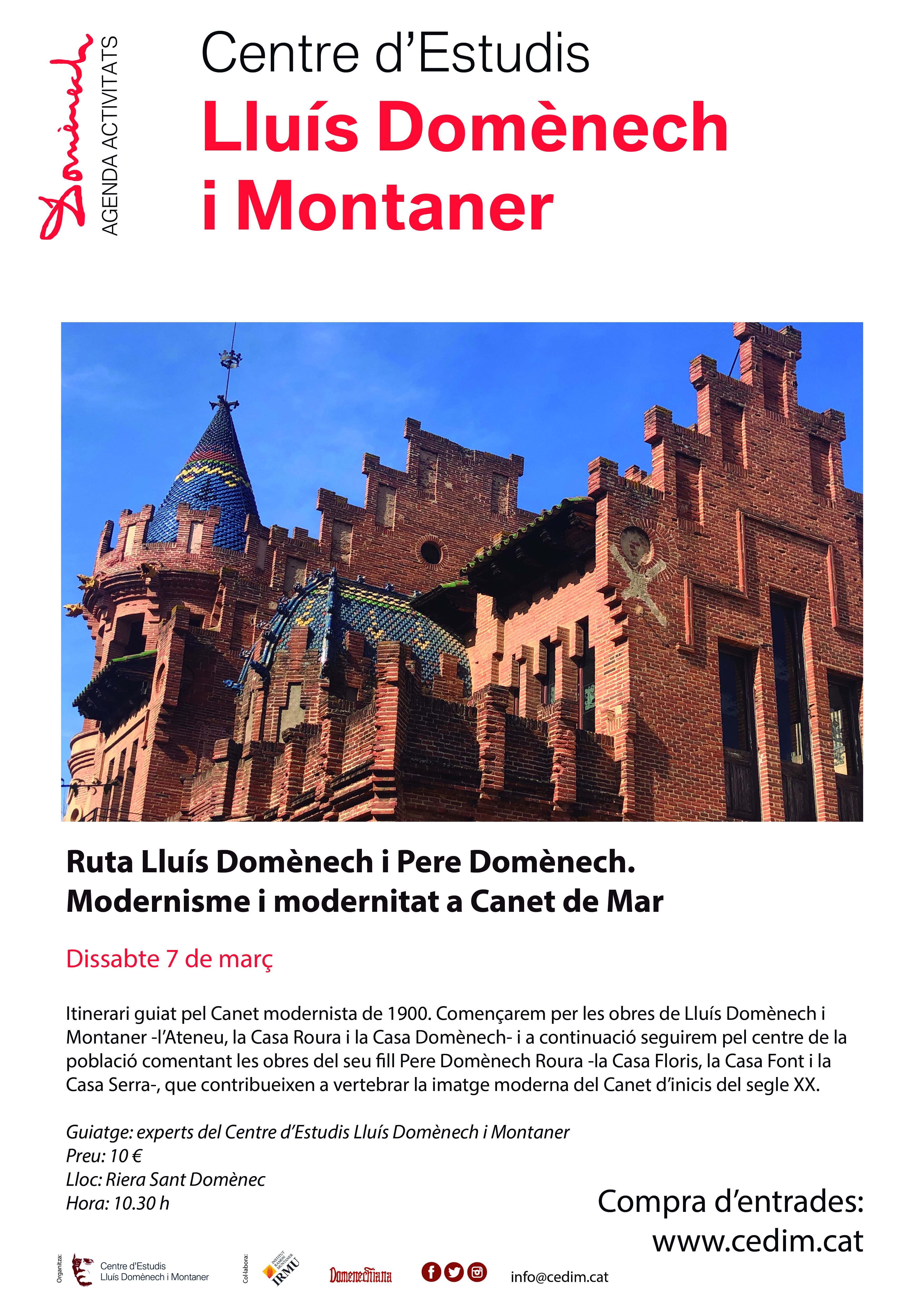 Començarem per les obres de Lluís Domènech i Montaner -l'Ateneu, la Casa Roura i la Casa Domènech- i a continuació seguirem pel centre de la població comentant les obres del seu fill Pere Domènech Roura -la Casa Floris, la Casa Font i la Casa Serra-, que contribueixen a vertebrar la imatge moderna del Canet d'inicis del segle XX. Guiatge: experts del Centre d'Estudis Lluís Domènech i Montaner.