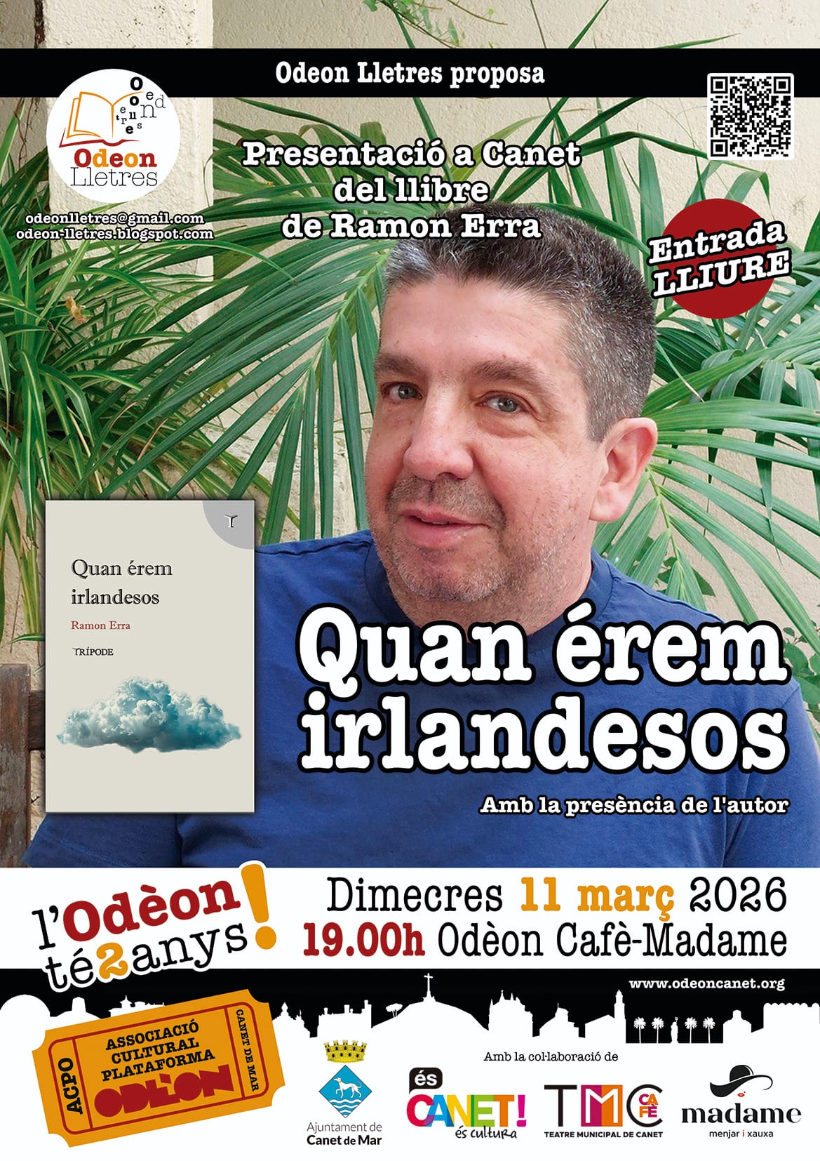Parlarem amb l'escriptor de Canet de Mar i professor de l'Escola d'Escriptura de l'Ateneu Barcelonès Ramon Erra, que acaba de publicar "Quan érem irlandesos". En aquesta obra, que podrem adquirir durant la presentació, Erra ens convida a fer un viatge que comença a Irlanda però que, ben aviat, es ramifica en múltiples direccions: la del record, la de la identitat, la de la memòria cultural i personal.