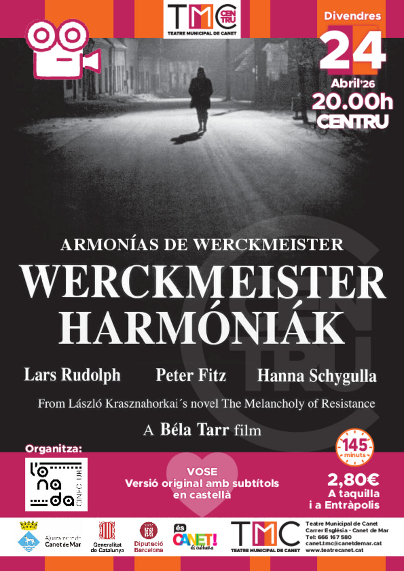 "Armonías de Werckmeister” de Béla Tarr és una experiència inoblidable. Ens recorda (com ho fan tots els films de Tarr) la bellesa potencial del cinema narratiu que tant sovint reposa ocult darrere de convencions i fòrmules predictibles. Armonías de Werckmeister opera en molts nivells és un esdeveniment cinematogràfic com de somni, inusual i molt recomanable (Jim Jarmusch). Presentació a càrrec de David Ferragut.