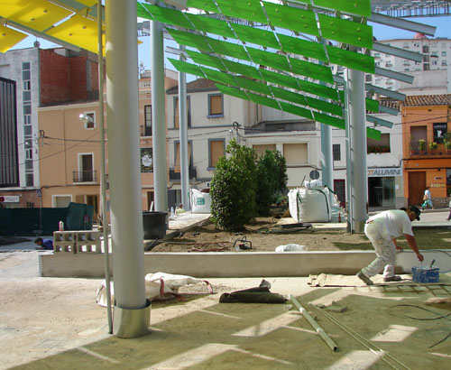 Les peces de colors de les pèrgoles ja estan col·locades i es pot apreciar com el sol les travessa i omple de llum la plaça.