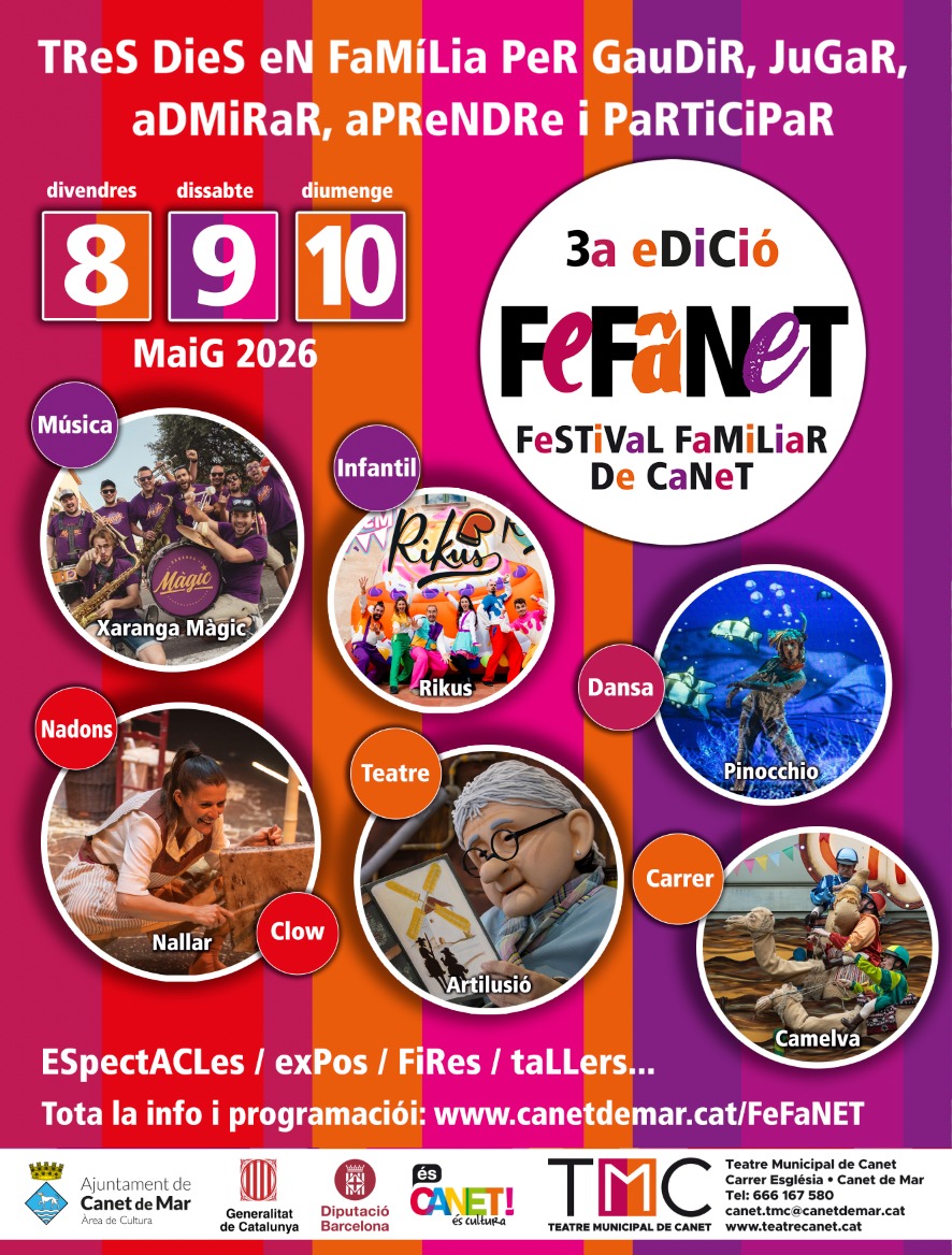 Els dies 8, 9 i 10 de maig de 2026 Canet torna a celebrar el FeFaNET, el Festival Familiar de Canet de Mar. Una oportunitat única per a les famílies d'arreu de Catalunya.